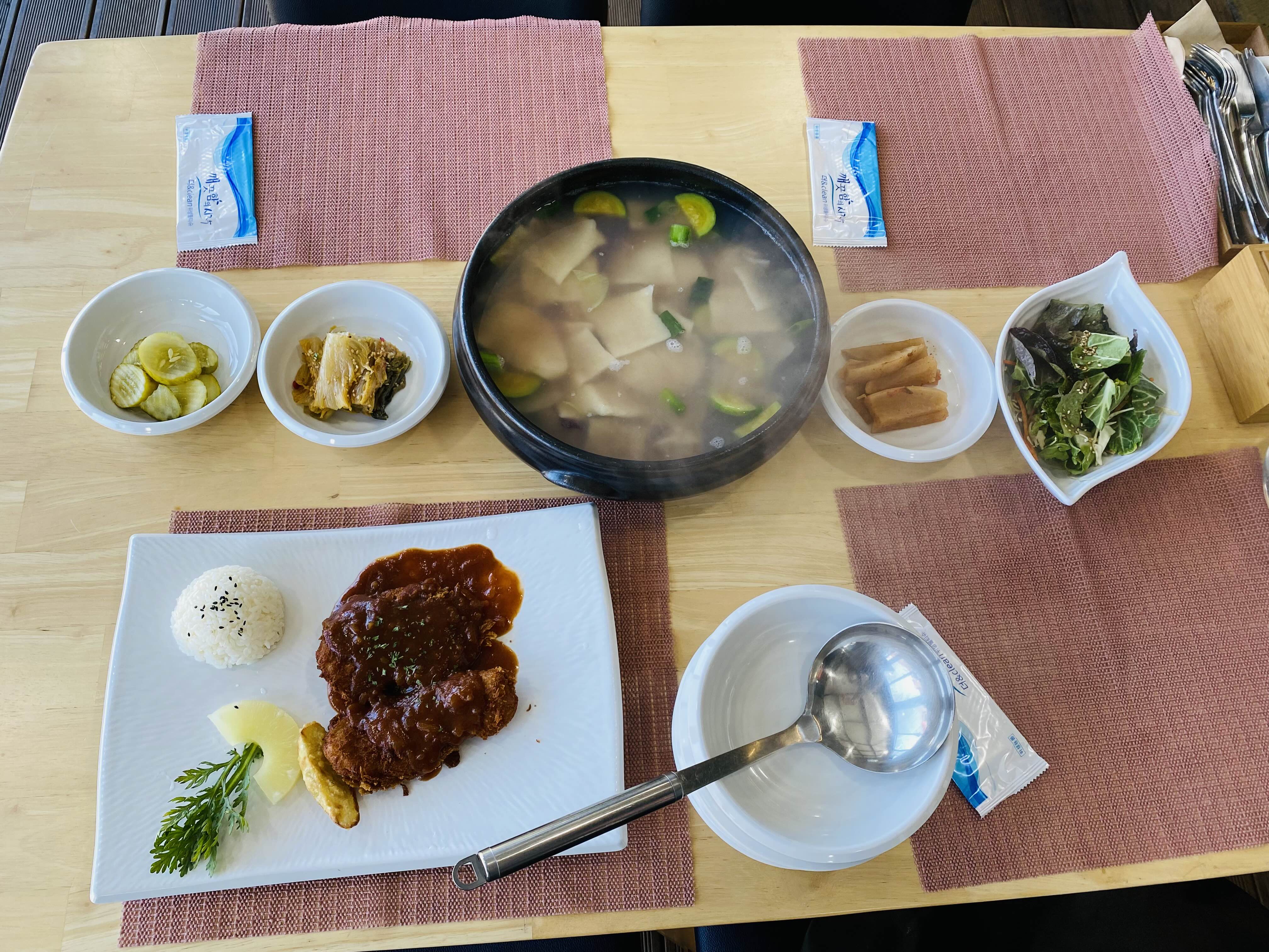 바지락 수제비 2인분과 수제 돈가스! 바지락 수제비에는 원래 고추가 들어가는데 아이들과 함께 먹을거라 고추를 빼주셨다.