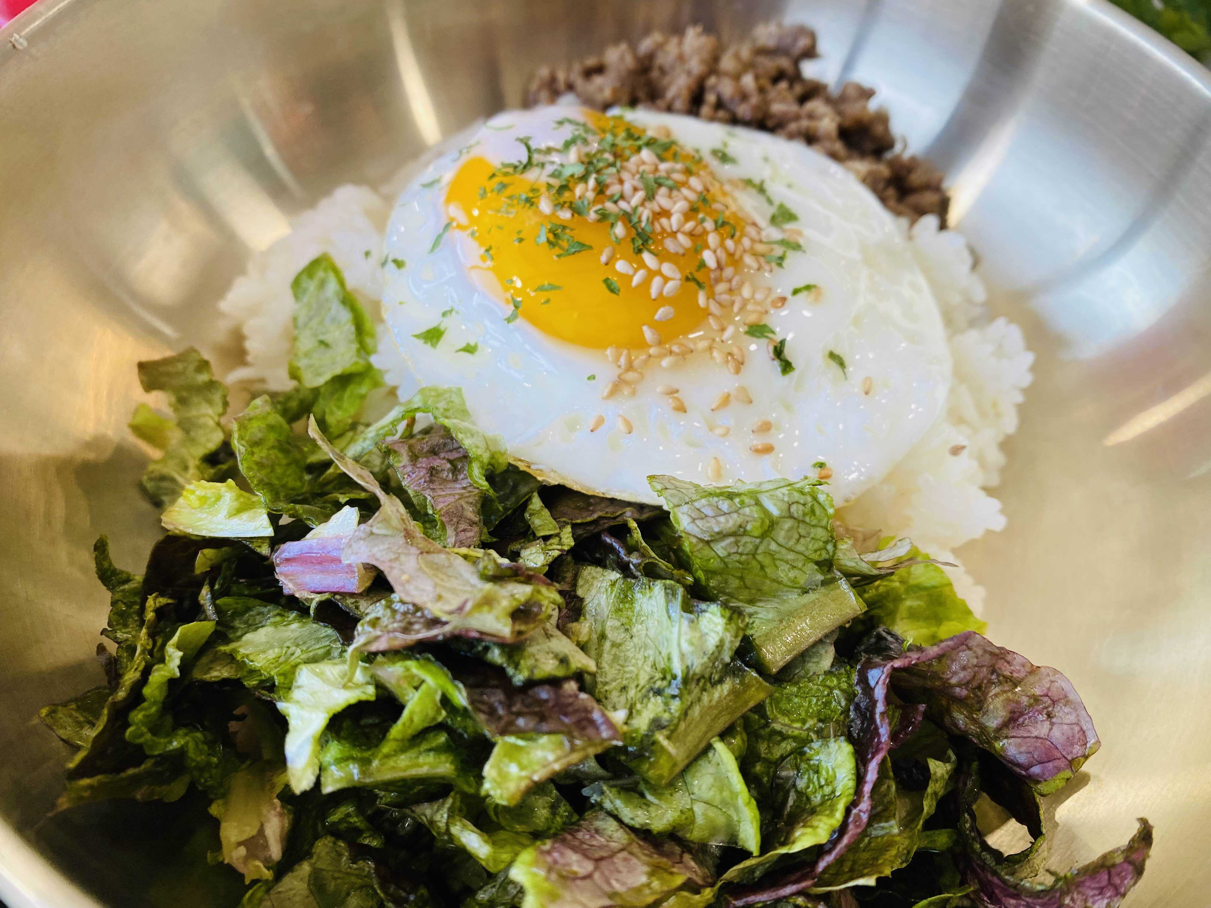 비빔밥은 밥, 고기, 계란, 상추는 그릇 안에 담겨져 오고 다양한 나물은 양것 담아 먹을 수 있도록 따로 나온다.