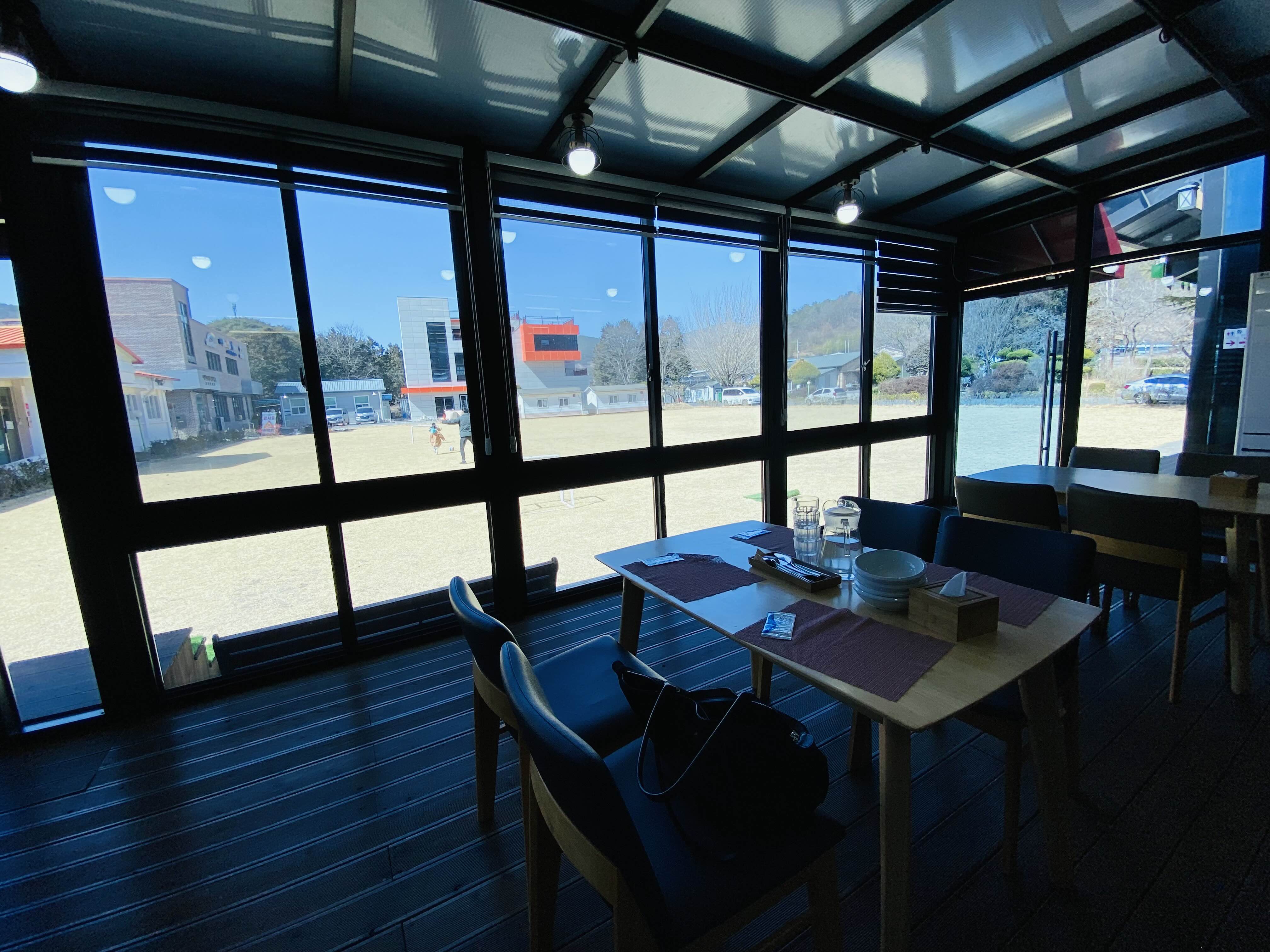 깔끔한 식당 내부에 운동장을 시원하게 바라볼 수 있게 통창이 나있어 아이들이 바깥에서 뛰어놀아도 지켜보기에 좋다.