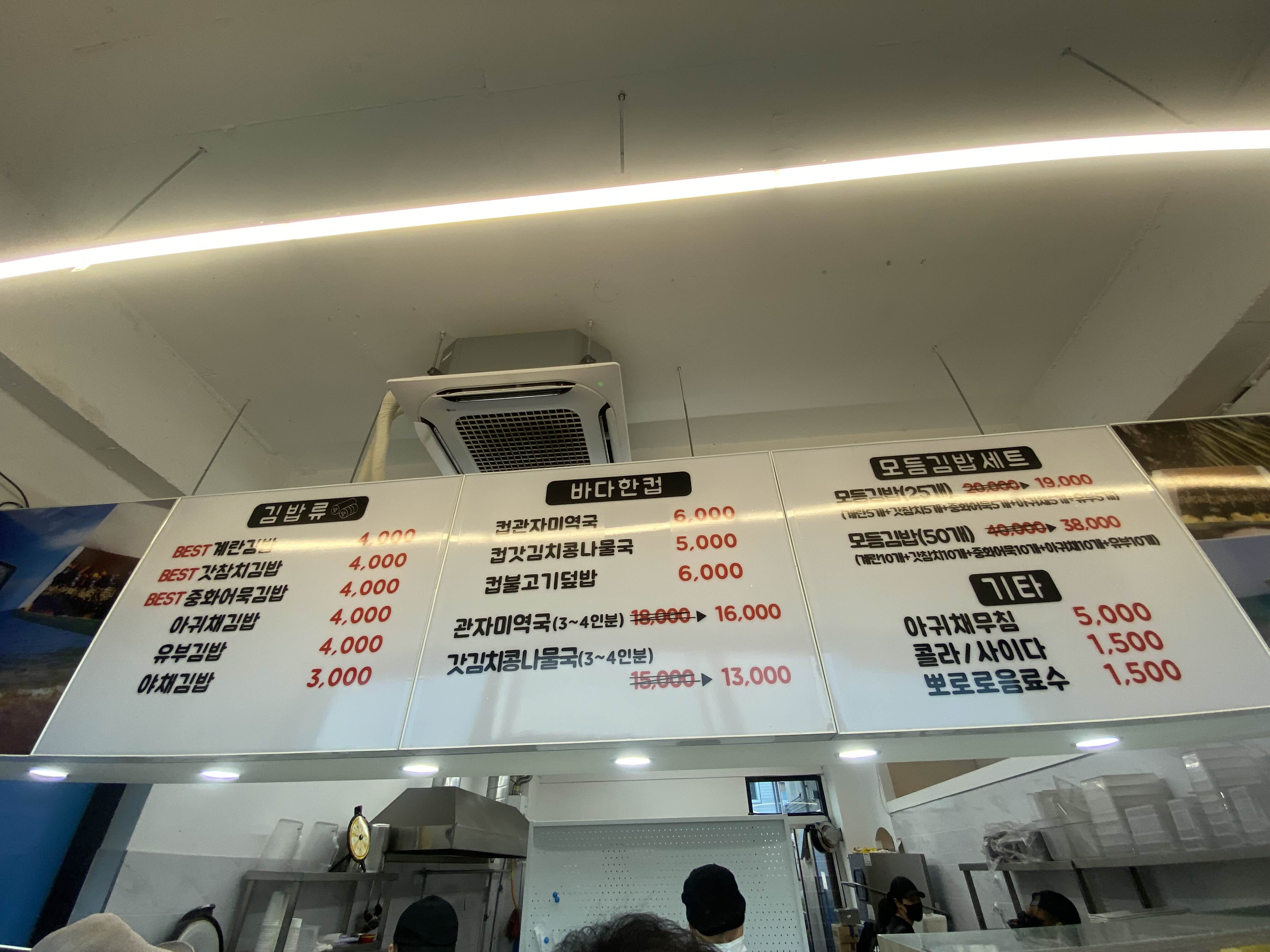 바다김밥 메뉴는 계란김밥, 갓김치김밥, 중화어묵김밥, 아귀채김밥, 유부김밥, 야채김밥 6가지이다.